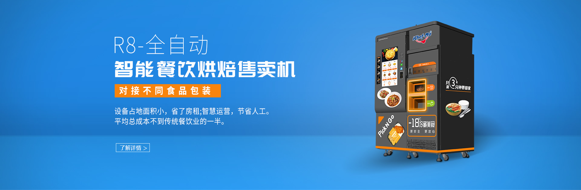 iChef-Ma是一家智慧餐饮新零售服务平台。利用领先的三分钟处理技术完美的实现了将食材从-18 ℃到+65 ℃的烘焙过程,以保证食材的口感及智慧自动售卖设备的优势,联合多家大型食品工厂建立长期战略合作关系,解决供应链及产品安全溯源问题。拥有10年经验及有零售成功案例的核心运营团队,成功申请多项国家技术专利,已然成为国内智慧餐饮新零售的标杆。